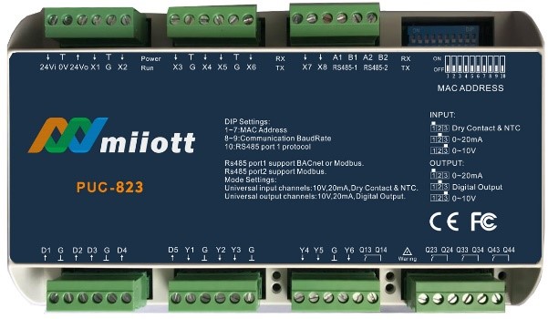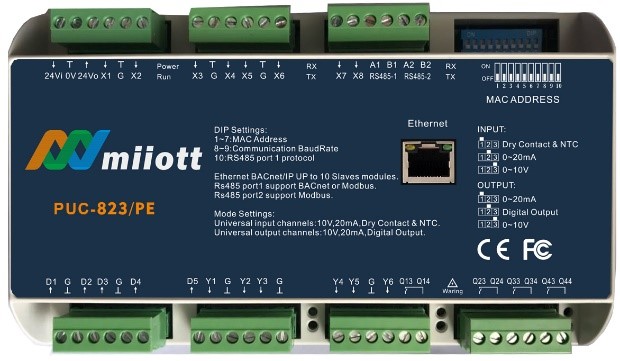 PUC-823/PE 是一款高性能完全可編程的 IP 控制器,可用于中央設備系統,空調機組,大終端單元以及其它控制設備,PUC-823/PE 作為主控制器,可通過 BACnet ms/tp 擴展,最大可擴展 10 個模塊。PUC-823/PE 作為樓控產品的一個組成部分,與 ANSI/ASHRAE 135-1995 樓宇自控網標準完全兼容。PUC-823/PE 自帶以太網口,支持 BACnet IP、BACnet ms/tp,Modbus rtu 通訊。PUC-823/PE 使用標準 BACnet 協議可以直接連接到100/1000M Ehernet,也可以在BACnet MS/TP網上進行通訊。使用圖形編程語言進行編程。用戶可以快速、直觀地完成控制邏輯的編寫。包括了運算環路。這些控制環路可以控制設備的各個部分或單元。使用非易失的FLASH 存儲器保存程序數據。
