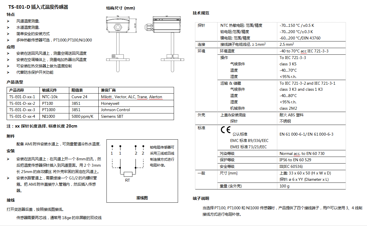 風道溫度測量,水道溫度測量,簡單安全的安裝方式,多種熱敏傳感器可選,T1000,PT100,Ni1000。 應用 安裝在送回風風道上,測量空調送回風溫度 安裝在空調箱體上,測量電加熱器出風溫度 可安裝在熱交換器上做為溫度控制 代替防凍保護開關功能